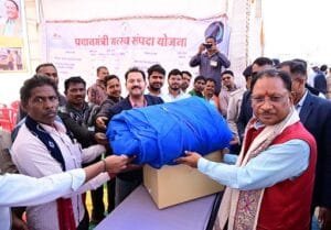 मुख्यमंत्री श्री विष्णुदेव साय द्वारा विभिन्न विभागों के हितग्राहियों को सामग्री एवं प्रमाण पत्र का वितरण किया गया। इसमें कृषि विभाग द्वारा किसान क्रेडिट कार्ड, उद्यान विभाग द्वारा पावर स्प्रेयर, पशुधन चिकित्सा विभाग द्वारा बैकयार्ड कुक्कट इकाई, लोक स्वास्थ्य यांत्रिकी विभाग द्वारा जल जीवन मिशन, मत्स्य पालन विभाग द्वारा नाव जाल योजना और फुटकर मछली विक्रय योजना, स्वास्थ्य विभाग द्वारा आयुष्मान कार्ड, शिक्षा विभाग द्वारा स्थाई कोरवा जाति प्रमाण पत्र, पंचायत एवं ग्रामीण विकास विभाग द्वारा प्रधानमंत्री आवास योजना ग्रामीण, खाद्य विभाग द्वारा प्रधानमंत्री उज्जवला योजना, श्रम विभाग द्वारा असंगठित कर्मकार प्रसूति सहायता योजना, अंत्यवसाई विभाग द्वारा अनुसूचित जनजाति आदिवासी महिला सशक्तिकरण, स्मॉल बिजनेस योजना, अंत्योदय स्वरोजगार योजना और महिला एवं बाल विकास विभाग द्वारा सुकन्या समृद्धि योजना के 05-05 हितग्राही शामिल रहे।