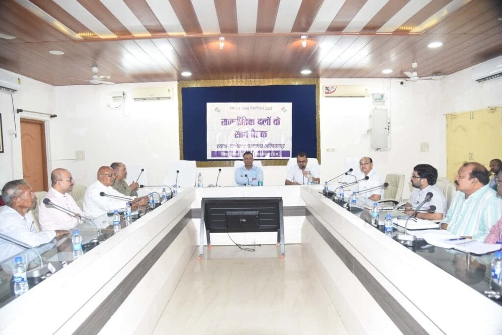 Ambikapur News : अम्बिकापुर 4 अक्टूबर 2023/ विधानसभा निर्वाचन 2023 हेतु भारत निर्वाचन आयोग के दिशा निर्देशों के अनुरूप कलेक्टर एवं जिला निर्वाचन अधिकारी श्री कुन्दन कुमार की अध्यक्षता में बुधवार को कलेक्ट्रेट सभाकक्ष में राजनैतिक दलों की बैठक तथा मीडिया के प्रतिनिधियों के साथ प्रेसवार्ता आयोजित की गई। जिला कलेक्टरेट सभाकक्ष में विभिन्न राजनीतिक दलों के प्रतिनिधि भारतीय राष्ट्रीय कांग्रेस से श्री संतोष गोयल, भारतीय जनता पार्टी से श्री आलोक दुबे, श्री करताराम गुप्ता,श्री अभिषेक शर्मा, छत्तीसगढ़ जनता कांग्रेस से ज्योति सिसोदिया, आम आदमी पार्टी से श्री राजेन्द्र बहादुर सिंह, श्री रवि रंजन पाठक, बहुजन समाज पार्टी से श्री प्रकाश किस्पोट्टा, श्री रामदास टोप्पो उपस्थित थे। इसी प्रकार प्रेसवार्ता में जिले के सभी प्रिंट मीडिया एवं इलेक्ट्रॉनिक मीडिया के प्रतिनिधि उपस्थित थे।