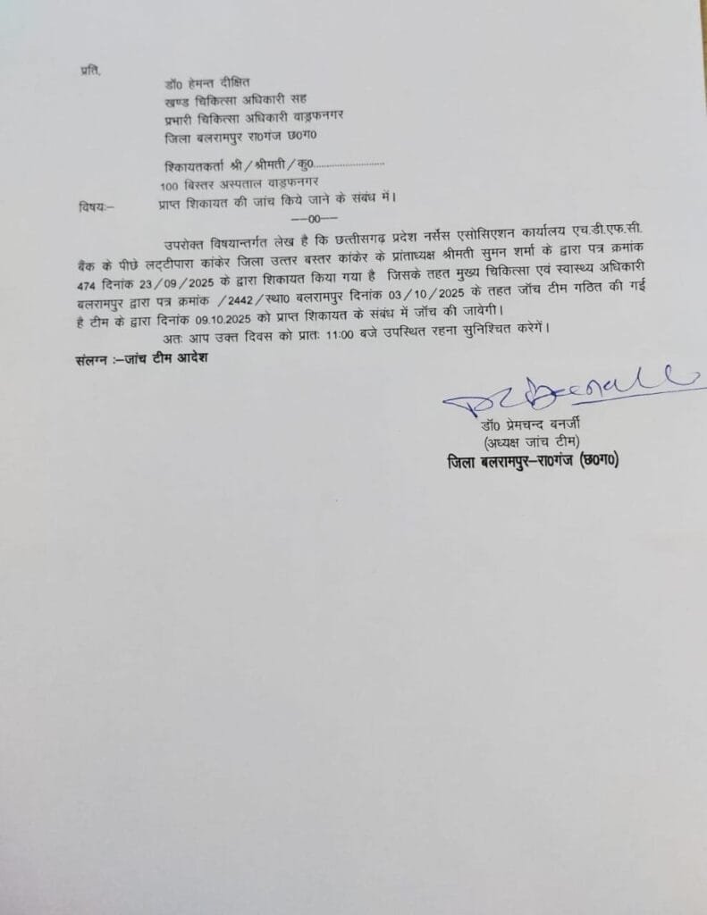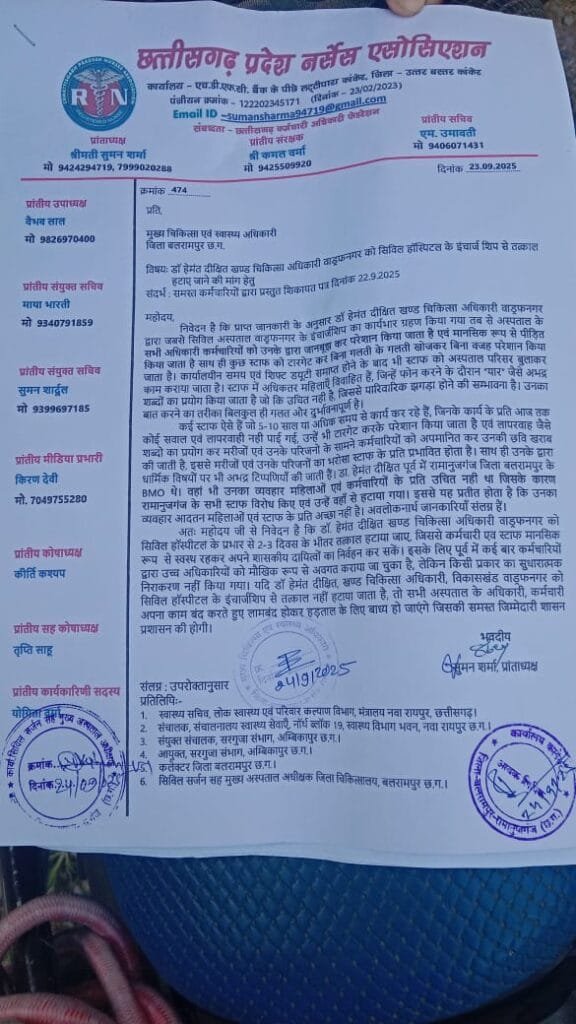 प्राप्त जानकारी के अनुसार, छत्तीसगढ़ प्रदेश नर्सेस एसोसिएशन की प्रांताध्यक्ष श्रीमती सुमन शर्मा द्वारा 23 सितंबर 2025 को मुख्य चिकित्सा एवं स्वास्थ्य अधिकारी (CMHO) बलरामपुर को पत्र भेजा गया था।