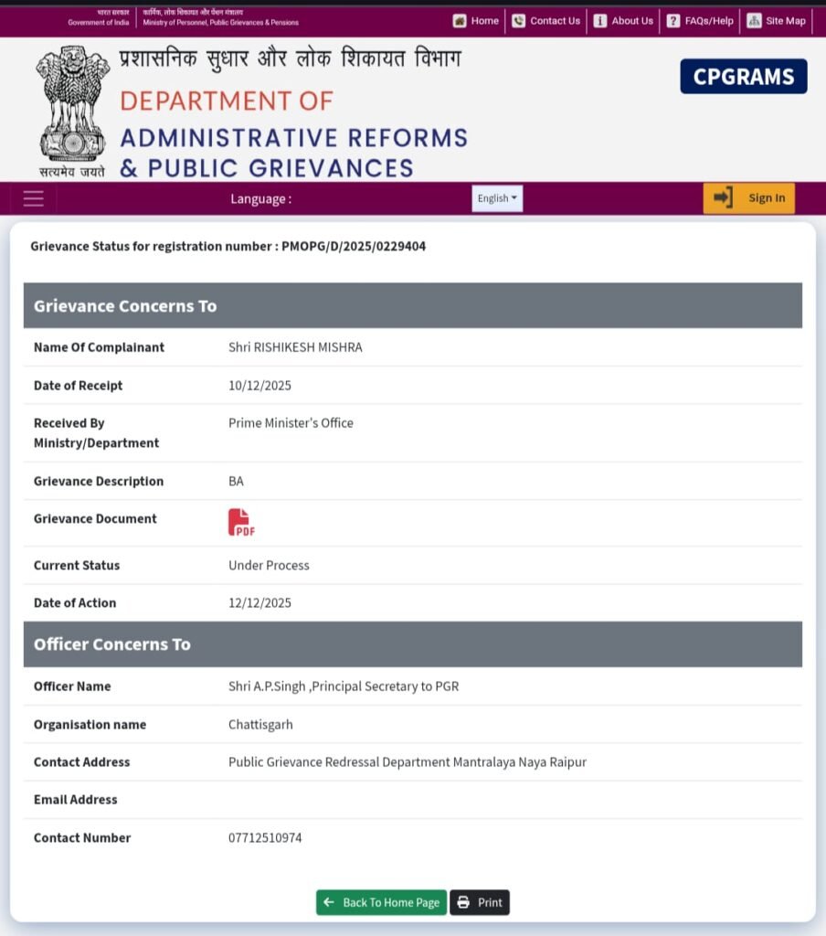 स्थानीय प्रशासन और कलेक्टर की चुप्पी के बाद, ऋषिकेश मिश्रा ने 6 दिसंबर 2025 को प्रधानमंत्री कार्यालय (PMO) में शिकायत दर्ज कराई।ताजा स्टेटस के अनुसार, शिकायत (पंजीकरण संख्या: PMOPG/D/2025/0229404) स्वीकार कर ली गई है और 12/12/2025 तक इसे कार्यवाही के लिए प्रोसेस में डाल दिया गया है। पत्रकार ने मांग की है कि : * बिना दोष सिद्ध हुए ‘अपराधी’ कहने पर अधिकारी पर FIR दर्ज हो। * सिविल सेवा आचरण नियम के उल्लंघन पर उन्हें बर्खास्त किया जाए। यह मामला अब सिर्फ एक अधिकारी और पत्रकार का नहीं, बल्कि अभिव्यक्ति की आज़ादी बनाम अफसरशाही के अहंकार का है। जिस “जनसंपर्क” विभाग का काम सरकार की छवि बनाना है, उसी की अधिकारी ने अपनी हरकतों से सरकार को कटघरे में खड़ा कर दिया है। अब देखना है कि क्या पीएमओ (PMO) और मुख्यमंत्री विष्णुदेव साय अपने गृह जिले में हो रहे इस “लोकतंत्र के चीरहरण” पर क्या कार्रवाई करते हैं?