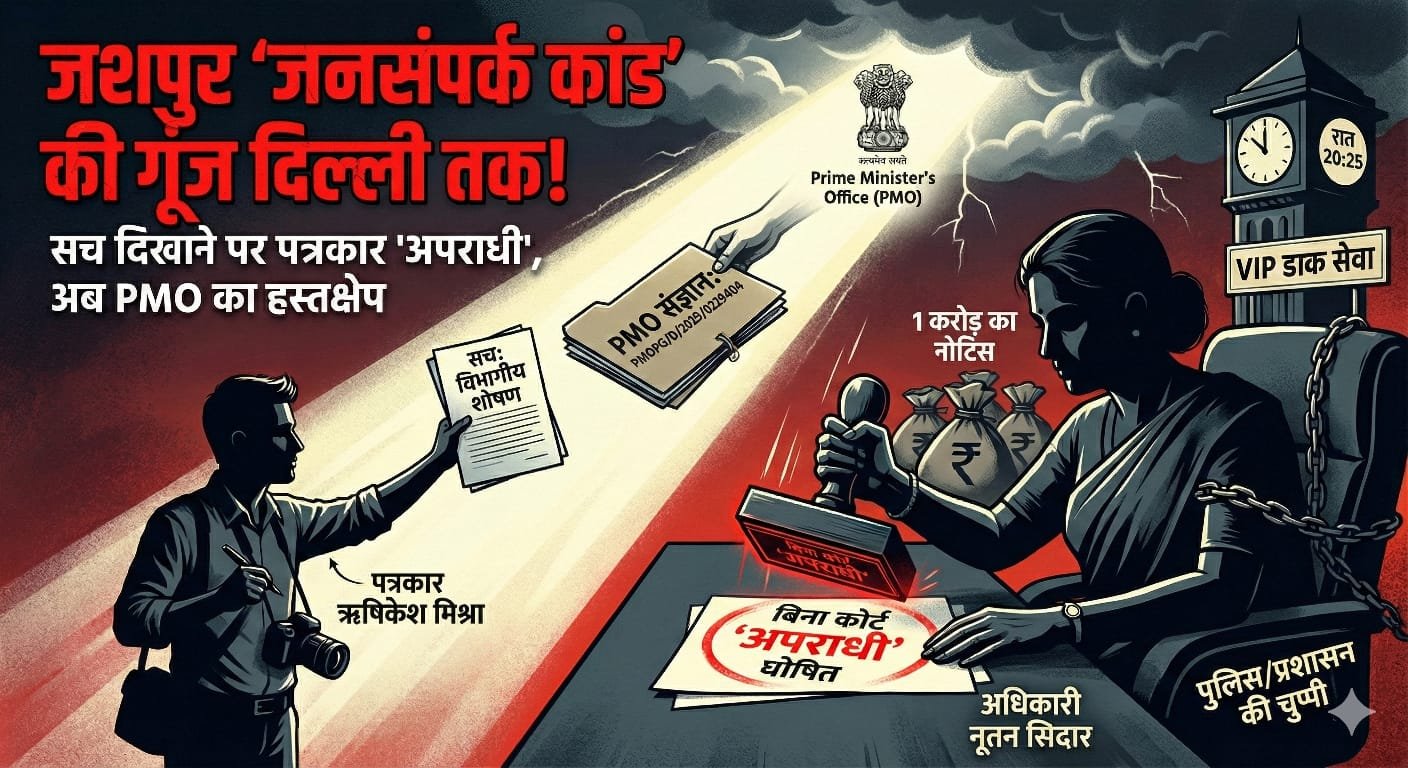रायगढ़/जशपुर/नई दिल्ली। विशेष रिपोर्ट :*छत्तीसगढ़ के जशपुर जिले में एक अधिकारी के अहंकार और लोकतंत्र के चौथे स्तंभ के बीच की लड़ाई अब प्रधानमंत्री कार्यालय (PMO) तक पहुँच चुकी है। जनसंपर्क विभाग की सहायक संचालक नूतन सिदार द्वारा अपने पद का दुरुपयोग कर एक पत्रकार को डराने, उसे बिना अदालती कार्यवाही के लिखित में ‘अपराधी’ घोषित करने और 1 करोड़ रुपये का नोटिस भेजने का मामला अब तूल पकड़ चुका है।*आत्महत्या की कोशिश और ‘गुलामी’ का सच उजागर करने की सजा :