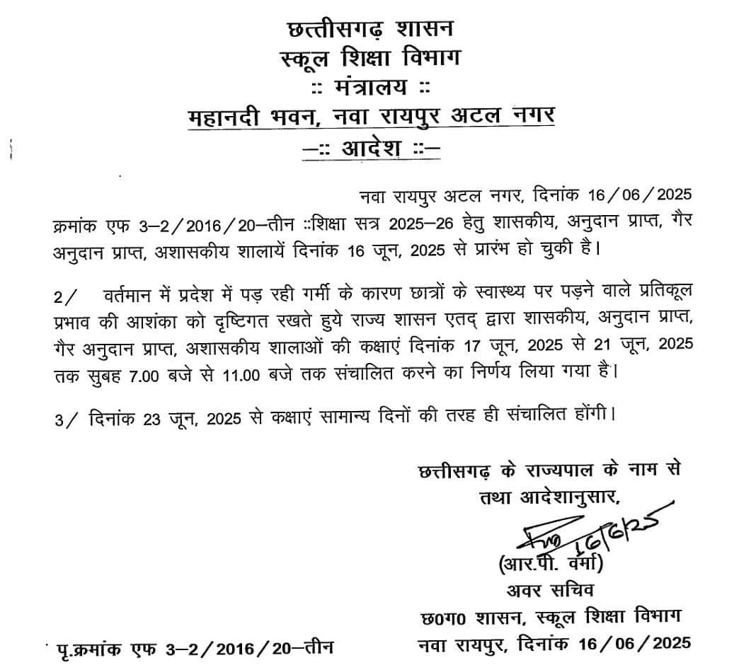 आदेश में यह भी उल्लेख है कि 23 जून 2025 से सभी शालाओं में कक्षाएं पूर्ववत सामान्य समयानुसार संचालित होंगी।
